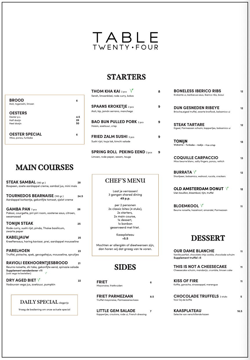 Wil jij lekker eten bij een restaurant in Haarlem Centrum waar kwaliteit, sfeer en locatie samenkomen, dan nodigen wij je van harte uit om kennis te maken met alles wat Table 24 te bieden heeft. Reserveer snel je tafel en ervaar zelf waarom wij een van de favoriete restaurants in Haarlem zijn! Let’s meet @ TABLE 24